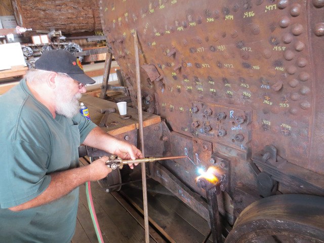 Ever since the corroded logging locomotive rolled up to its new home atop a lowboy trailer of an 18-wheeler last year, she has been gone over by a dedicated crew of 25 volunteers. Piece by rusty piece has been unbolted — or failing that — cut from her with a torch.