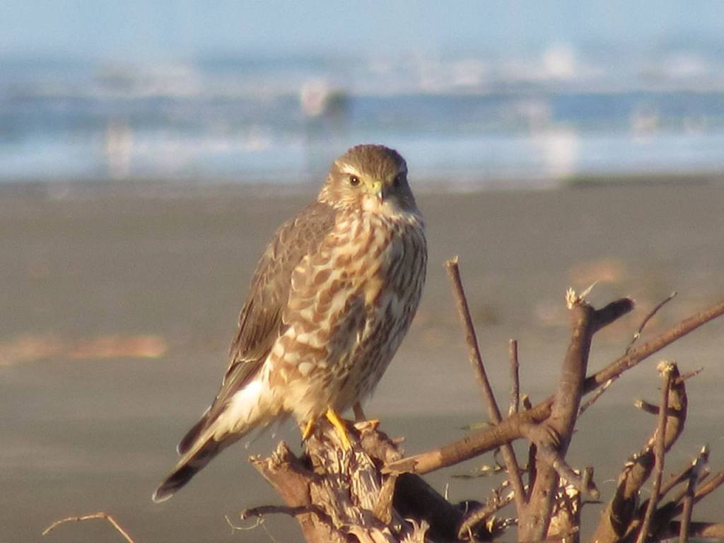 When and Where to Find in Grays Harbor: Merlins can be found out on the beach and in open areas near forests from August through April. It takes some careful looking to see them; they blend in well, and they are really, really fast. But beware….searching for a Merlin is a lot more addicting than Pokeman Go.