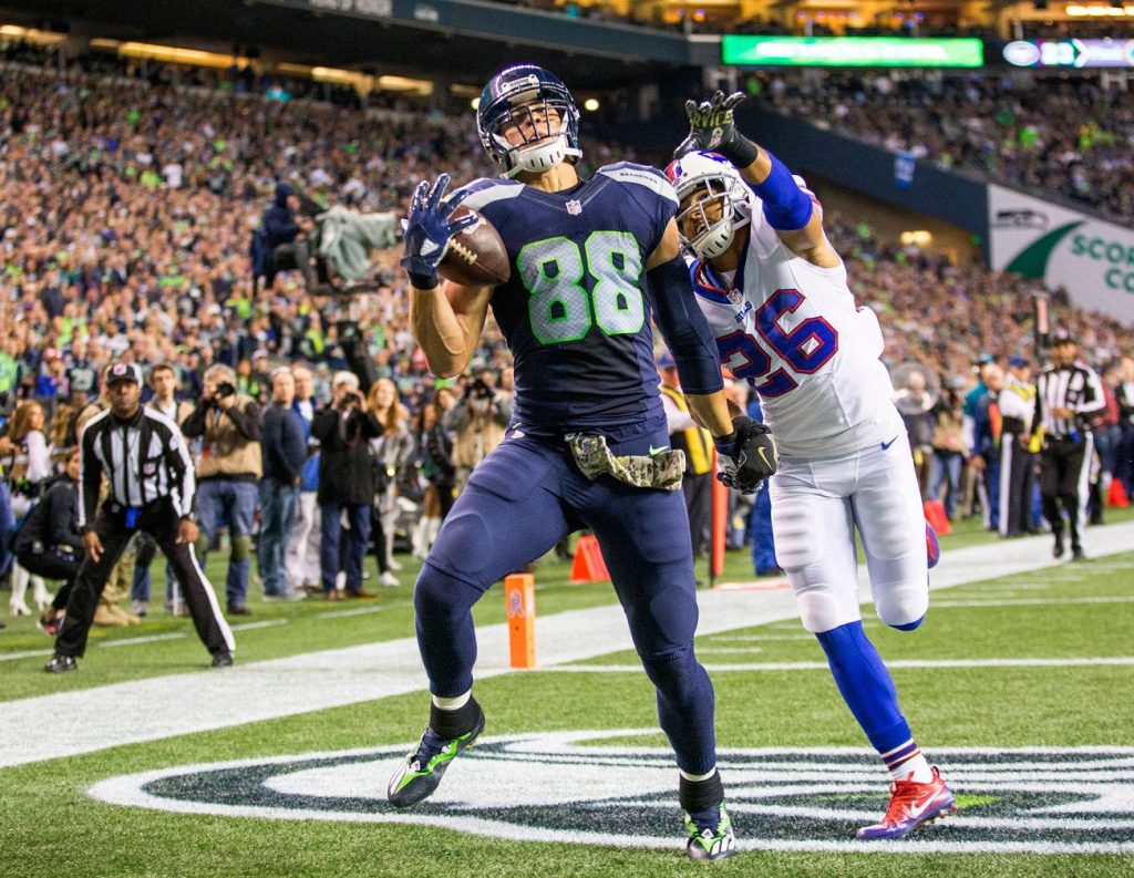 As amazing as Graham’s one-handed grabs were, sandwiched between the first two passing touchdowns for the Seahawks since Week 4 against the Jets, one quick jump is the real reason Seahawk fans should be chirping Graham’s name this week. With 2:19 left in the first half, Wilson hit Graham with a short pass to the left. Graham turned upfield where Buffalo’s Stephon Gilmore was breaking down, ready to wrap up the tight end’s legs. This is when the jaws of a CenturyLink Field record 69,084 people dropped — Graham ran hard and jumped over Gilmore, clearing the defender like a hurdle.