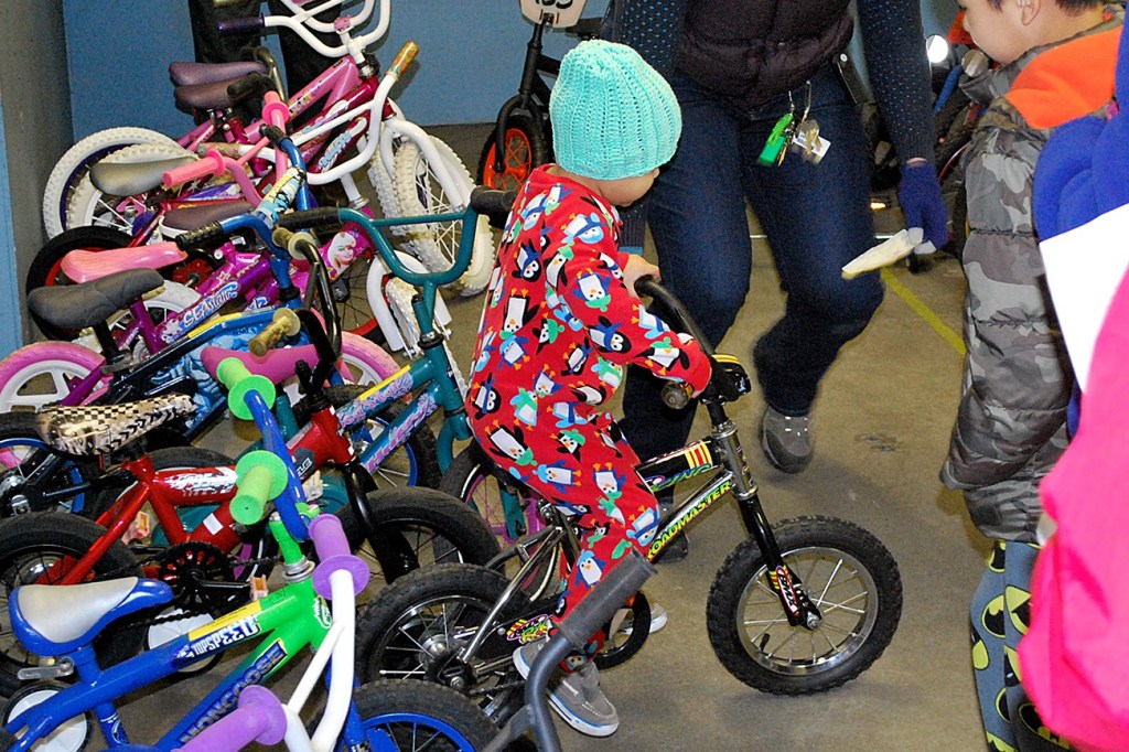 The skies were slate gray, the temperature was below freezing and one could even see a little snow blowing around an old warehouse at the Grays Harbor Historical Seaport Saturday morning, but even that couldn’t put a damper on the enthusiasm of children as they picked their favorite bike out of the more than 100 provided by the Aberdeen Lions Club at their annual Bicycles from Heaven event.