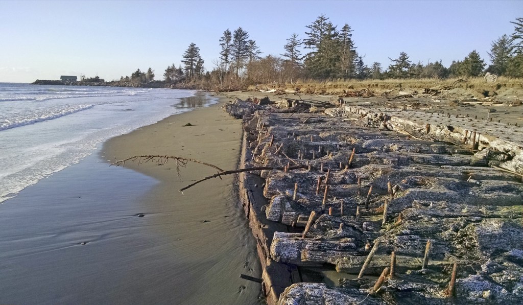 The approximately 125-foot-by-20-f00t. piece of what appears to be hull and/or deck timbers held together with large spikes first showed herself in late December 2009. Storm-tossed waves ate away huge chunks of the bank line just south of Warrenton Cannery Road, revealing a hint of what was to come.