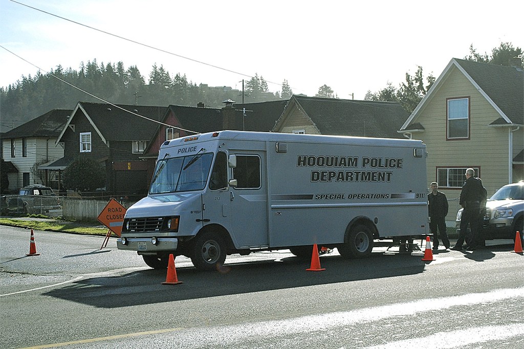 The Hoquiam Police Department Special Operations van blocks the entrance to Wheeler Avenue. (BOB KIRKPATRICK|THE DAILY WORLD)