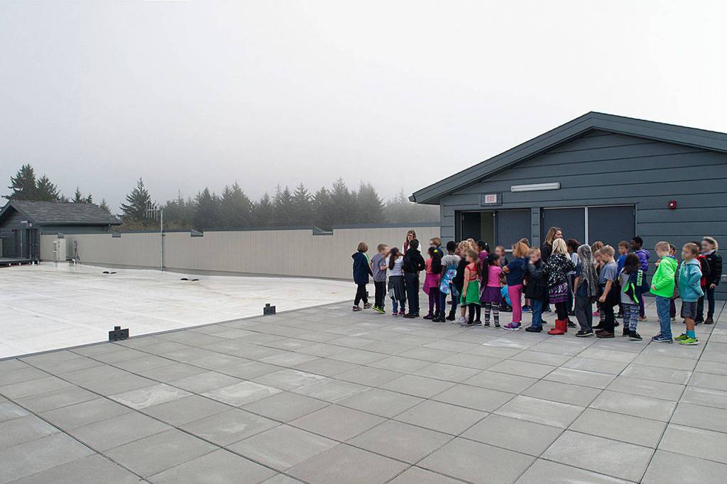The tsunami evacuation deck sits atop the school’s multipurpose room/gym/cafeteria wing and can hold up to 2,000 people. The building is engineered to withstand a magnitude 9 Cascadia megaquake and the tsunami it would likely generate. Construction on the school complex and tsunami platform began in late 2014 and the school was officially dedicated just last June.