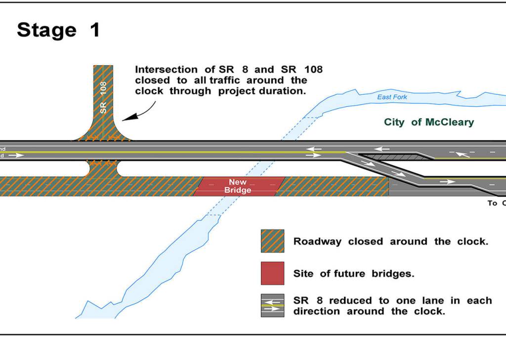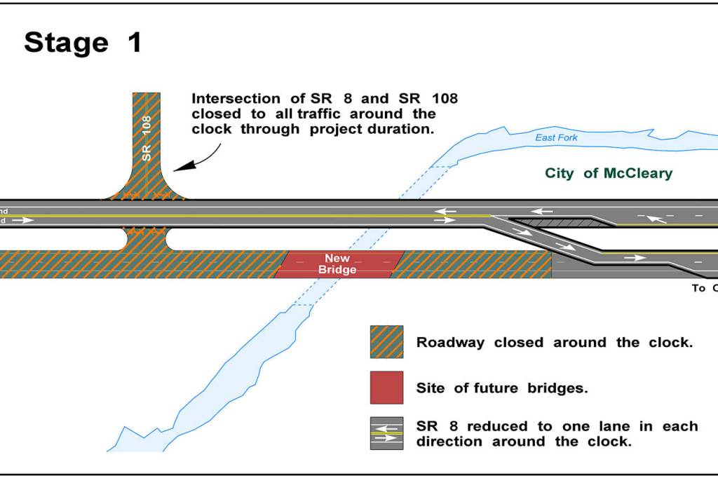 Compounding the inconvenience to motorists is the fact that the work occurs very near another State Route 8 project in McCleary in which the Department of Transportation is removing fish barriers and replacing them with bridges. Starting in mid-April, crews will reduce State Route 8 to one lane in each direction around the clock for two years. The State Route 8/State Route 108 interchange closed to traffic Friday, and will remain closed through the summer of 2019. During that time traffic will be diverted to the Mox Chehalis Road interchange to the east.