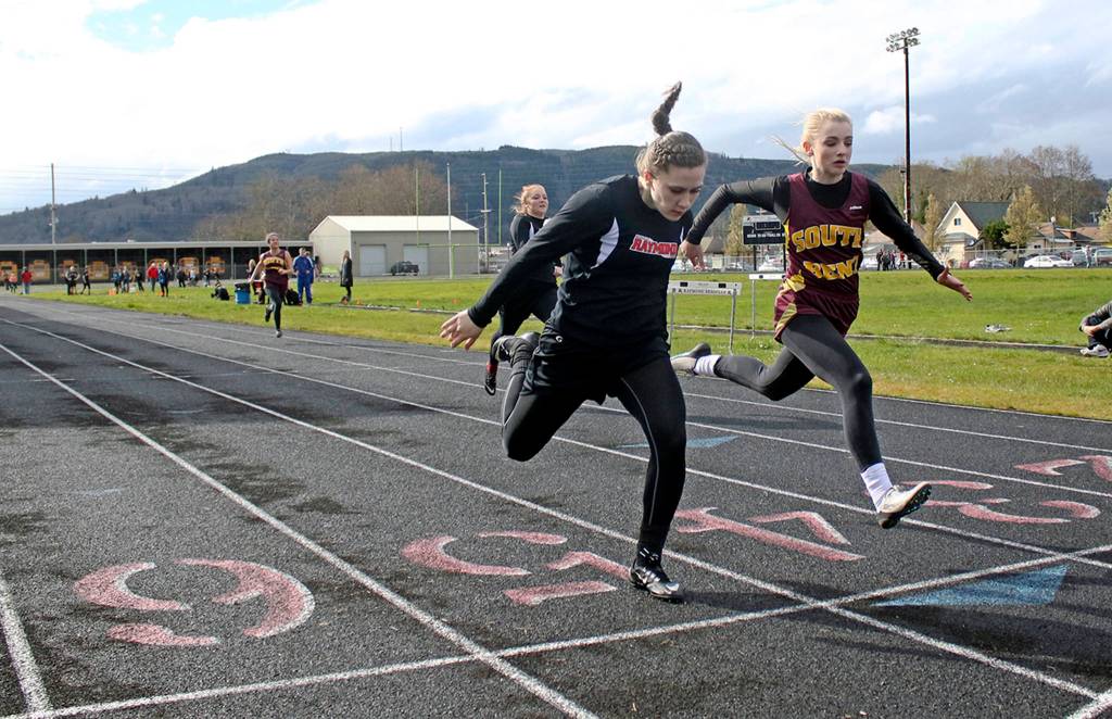 (Brendan Carl | The Daily World) Raymond Karlee Freeman leans past South Bend’s Hannah Byington at the finish line during the 100 meter dash at the Henrie-Weisel Tri-District Track Meet on Thursday at Raymond.