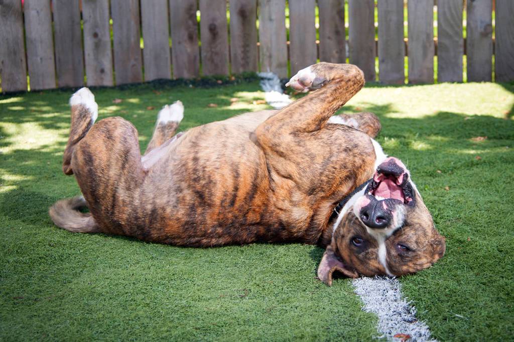 Dozer is a 2-year-old pit mix. When he arrived at the PAWS shelter, he became an immediate favorite. This big hunk o’ love will crawl around on his belly, begging for your attention.