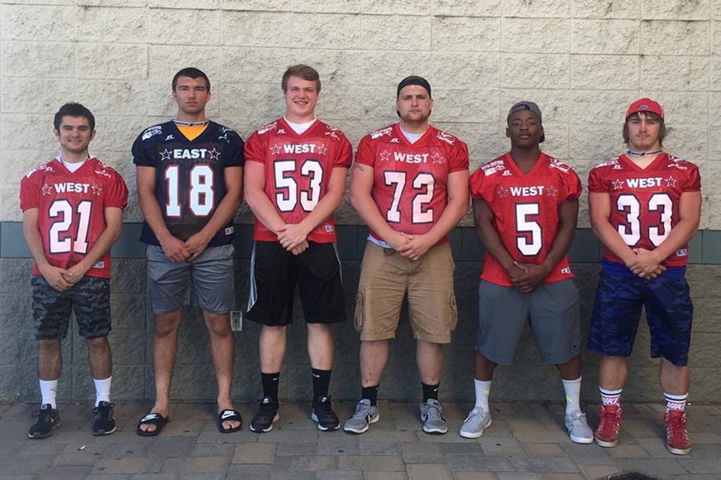 (Tom Sanchez) Six Twin Harbor high school football players participated in Saturday’s Earl Barden East-West All-Star Classic in Yakima on Saturday. The players were (from left) South Bend’s A.J. Sanchez, Aberdeen’s Braden Castleberry-Taylor, Raymond’s Luke Hamilton, Montesano’s Taylor Rupe, Hoquiam’s Artimus Johnson and Pe Ell-Willapa Valley’s Kaelin Jurek.