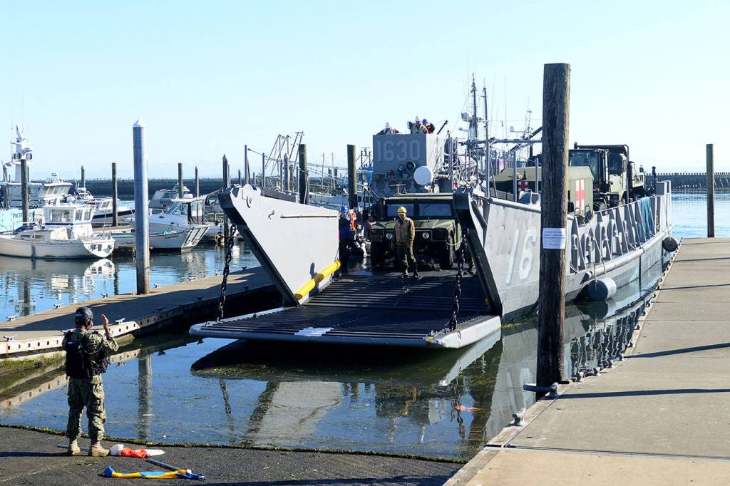 A landing craft made its way into the south entrance of the marina, slowly navigating its way to the boat launch. The gate at the bow of the craft was lowered, and several pieces of equipment were driven up the launch, including a front end loader, an Army ambulance and several Hummer-styled vehicles. They were then parked and on display just outside of or inside the Coast Guard base for the public to view inside and out.