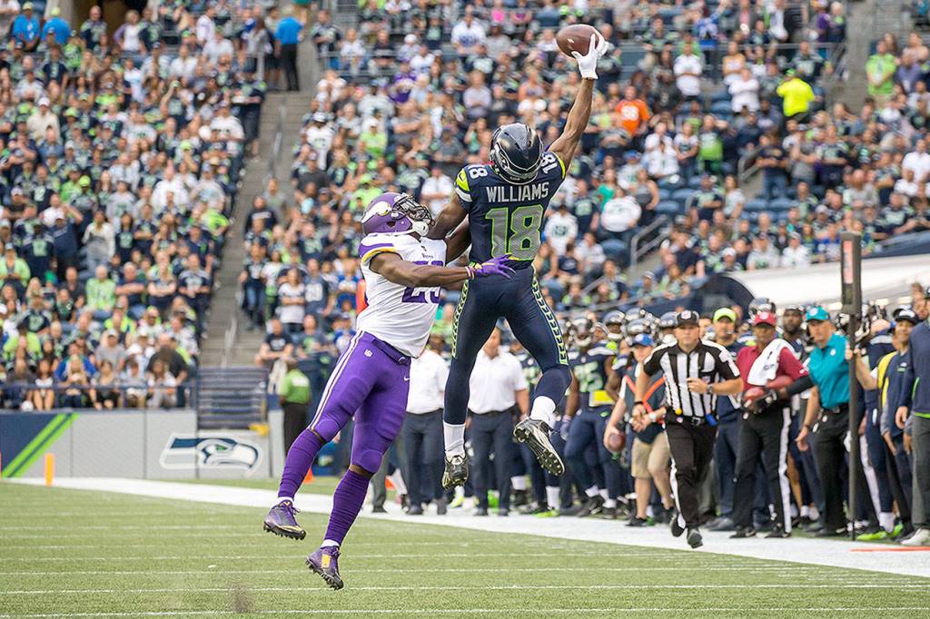 Former Seattle Seahawks wide receiver Kasen Williams makes a one-handed catch in the first quarter against the Minnesota Vikings on Friday, Aug. 18, at CenturyLink Field in Seattle. Williams was cut by the Seahawks and picked up by the Cleveland Browns over the weekend. (Bettina Hansen/Seattle Times)