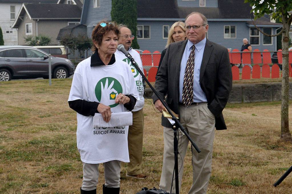 Former 24th District State Representative Lynn Kessler of Hoquiam speaks at the Safer Homes Coalition suicide prevention event at Franklin Field in Aberdeen Sunday morning. Behind her is 2nd Amendment Foundation founder Alan Gottlieb. To Kessler’s left is 24th District State Senator Jim Hargrove (D-Hoquiam). Behind him is 33rd District Representative Tina Orwall (D-Auburn). The focus was removing the means of suicide by securing firearms and opioids and how to spot the warning signs of depression. Visitors got an education and were given free gun and prescription pill bottle locks.