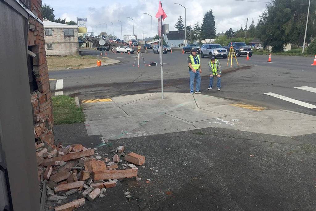 Hoquiam Police Chief Jeff Myers said the collision occurred at 22nd Street and Simpson Avenue, the intersection at the east end of the Simpson Avenue Bridge. The suspect was reportedly driving at a high rate of speed and swerving when he apparently ran the stop sign on 22nd Street and crashed into a 2014 Toyota Corolla, sending the Toyota into a brick building and trapping three occupants inside the car.