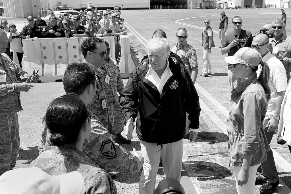 In a televised meeting with leaders of the recovery effort in a hangar at Muniz Air National Guard Base, Trump struck an upbeat note, praising the “amazing job” by first responders, the military and his own administration in the wake of the Category 4 storm.