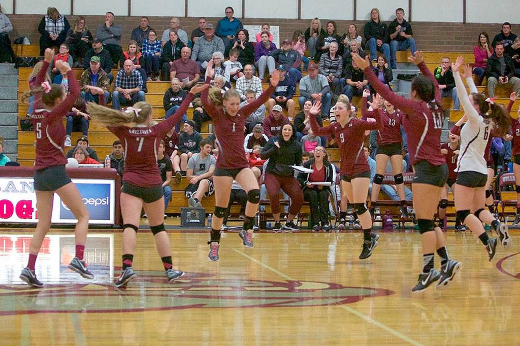 Photo by Patti Reynvaan — The Hoquiam volleyball team celebrates its four-game victory over rival Montesano on Thursday at Bo Griffith Memorial Gym.