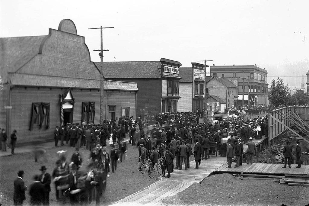 While it is impossible to be absolutely sure about the date and event, based on the buildings, the crowd, and by cross-referencing city directories, maps, newspapers and other photographs, it is likely that this photo was taken on the afternoon of Thursday, Sept. 19, 1901. Mayor William Anstie had proclaimed that a day of mourning in recognition of the funeral for President William McKinley, who had been assassinated 5 days earlier. In the proclamation, Anstie earnestly recommended that “from 12 o’clock noon of that day, all places of business be closed and that our citizens and people, as far as practicable, attend and participate in the memorial services to be held.” Among the day’s events were a parade of all fraternal and civic organizations that the Aberdeen Herald hailed as “the largest ever seen on Grays Harbor, and required twenty minutes to pass a given point,” followed by “excellent music and eloquent speakers” at Firemen’s Hall. Turnout was so great that the overflow crowd was sent to the Acme Opera House where additional speakers spoke articulately on the life of Our Martyred President.