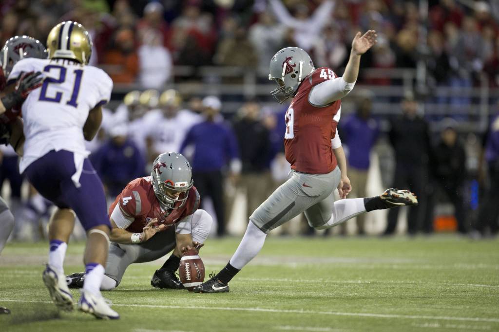 In the third overtime, UW kicker John Anderson toed his fifth consecutive field goal through the uprights at Martin Stadium to give the hosts – who were major underdogs – a three-point lead. That was followed by one of the most hotly-debated plays in the history of the century-old series.
