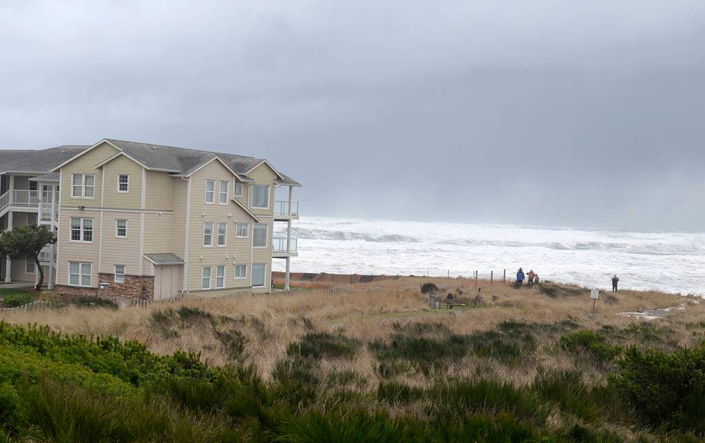 Farther down the beach at North Cove, waves were starting to come over the banks near the end of old State Route 109 early in the afternoon, but recent “dynamic revetment” projects to the north and south kept erosion to a minimum, according to irrigation district commission chairman David Cottrell.