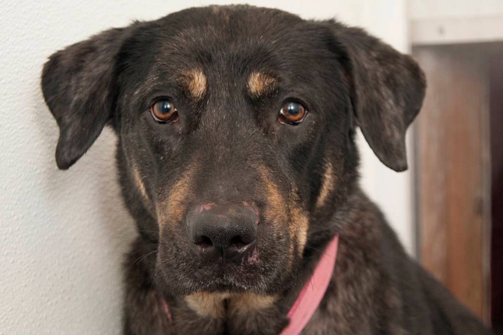 She sports the body of a large Lab, and will steal your heart with her eyes. She’s quiet and very good on a leash.