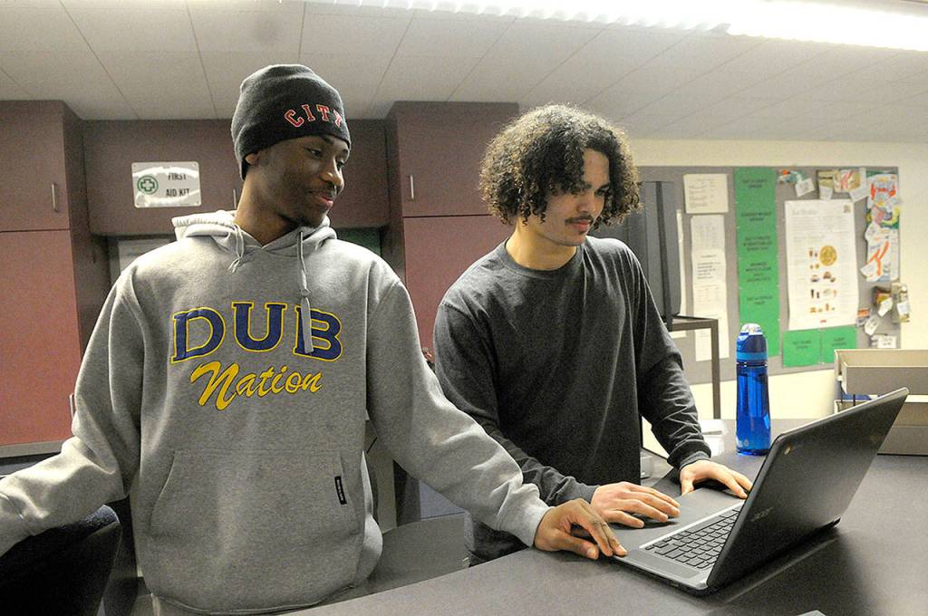 Russell Tillery, left, and Cornelius Holifield go over a homework assignment. Tillery is from Portland while Holifield hails from Southern California (Hasani Grayson | The Daily World)