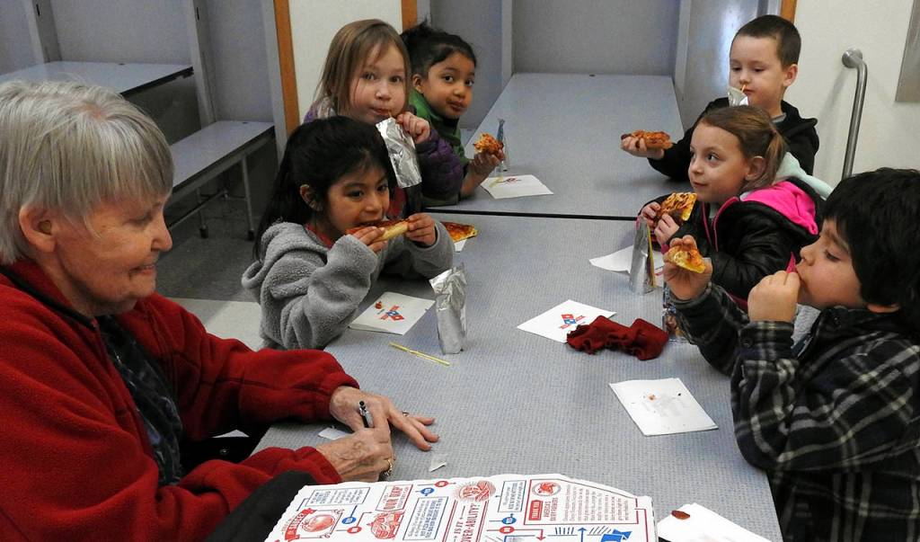 This week, six members of Patricia Timmons’ kindergarten class participated. The two boys and four girls were all kinds of excited to be at the head table. Some called out and waved to passing classmates, while others focused 100 percent on the food — and, of course, the prize drawings.