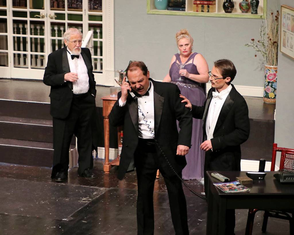 (Photo by Keith J. Krueger) Everyone scrambles to find Julia’s ringing cellphone in the stack of coats on the bed in the Driftwood Players production of “It’s Only a Play,” opening Friday.