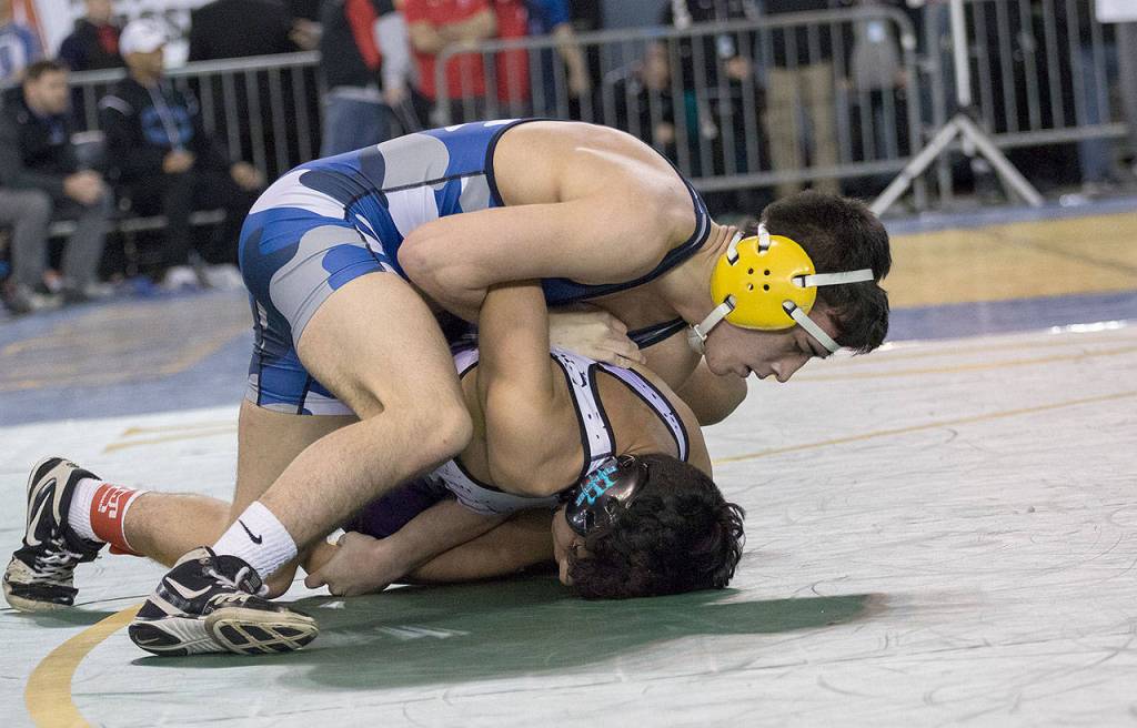 Aberdeen’s Tyler Souphommanichanh works to flip Robert Gomez of North Kitsap before earning a second-round pin to place seventh on Saturday. (Brendan Carl Photography)
