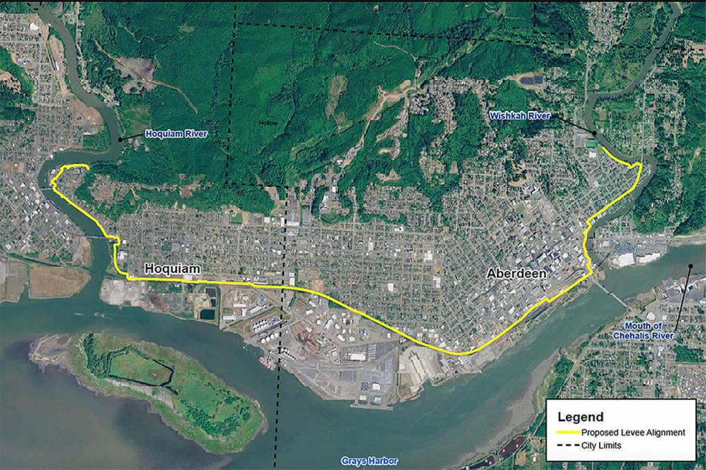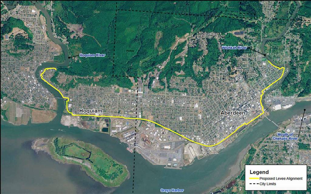 The levee would follow along the east bank of the Hoquiam River, and then curve around residential areas before ending on the west bank of the Wishkah River. Depending on the location, the levee is typically around three to five feet high, and will consist of a combination of earthen berms, concrete walls and sheet pile walls. Aberdeen and Hoquiam have been working in partnership on the project, but Aberdeen is the lead agency and has been administering the funds.