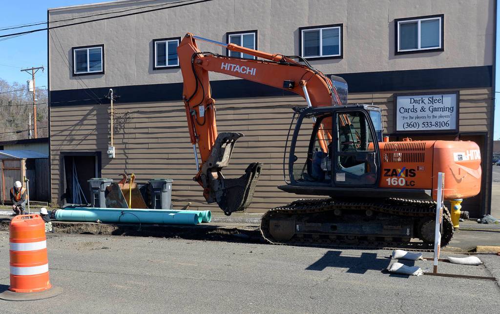 DAN HAMMOCK | THE DAILY WORLD                                Work began earlier this month to replace the outdated and inadequate stormwater drainage system on Ontario Street and Simpson Avenue. This Tuesday afternoon photo shows the large replacement drainage pipes replacing the old, smaller pipes.