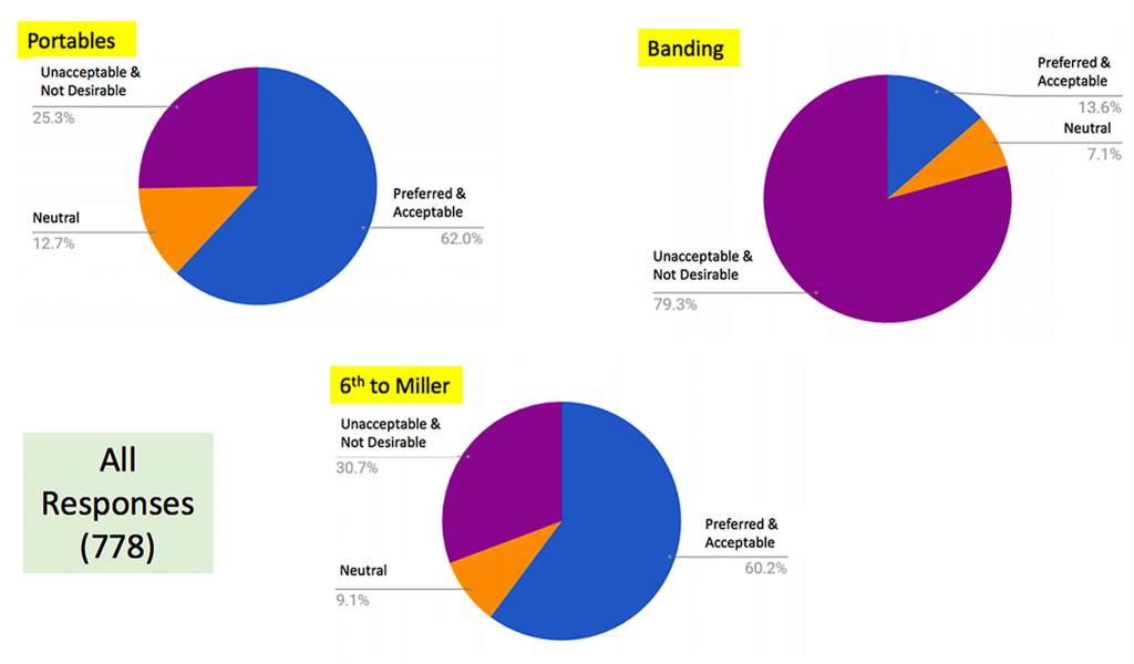 The other two options received more mixed reviews between staff and community members. The 232 staff members who returned surveys were more likely in favor of moving sixth grades to Miller Junior High, with 54.3 percent saying that was the preferred option. Only 30.8 percent of the 546 community members said they prefer moving sixth grades, and a larger share of community members said they thought it was not desirable or unacceptable. The community results were more in favor of adding portables, with 67 percent either saying that was acceptable or preferable.