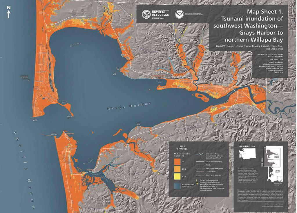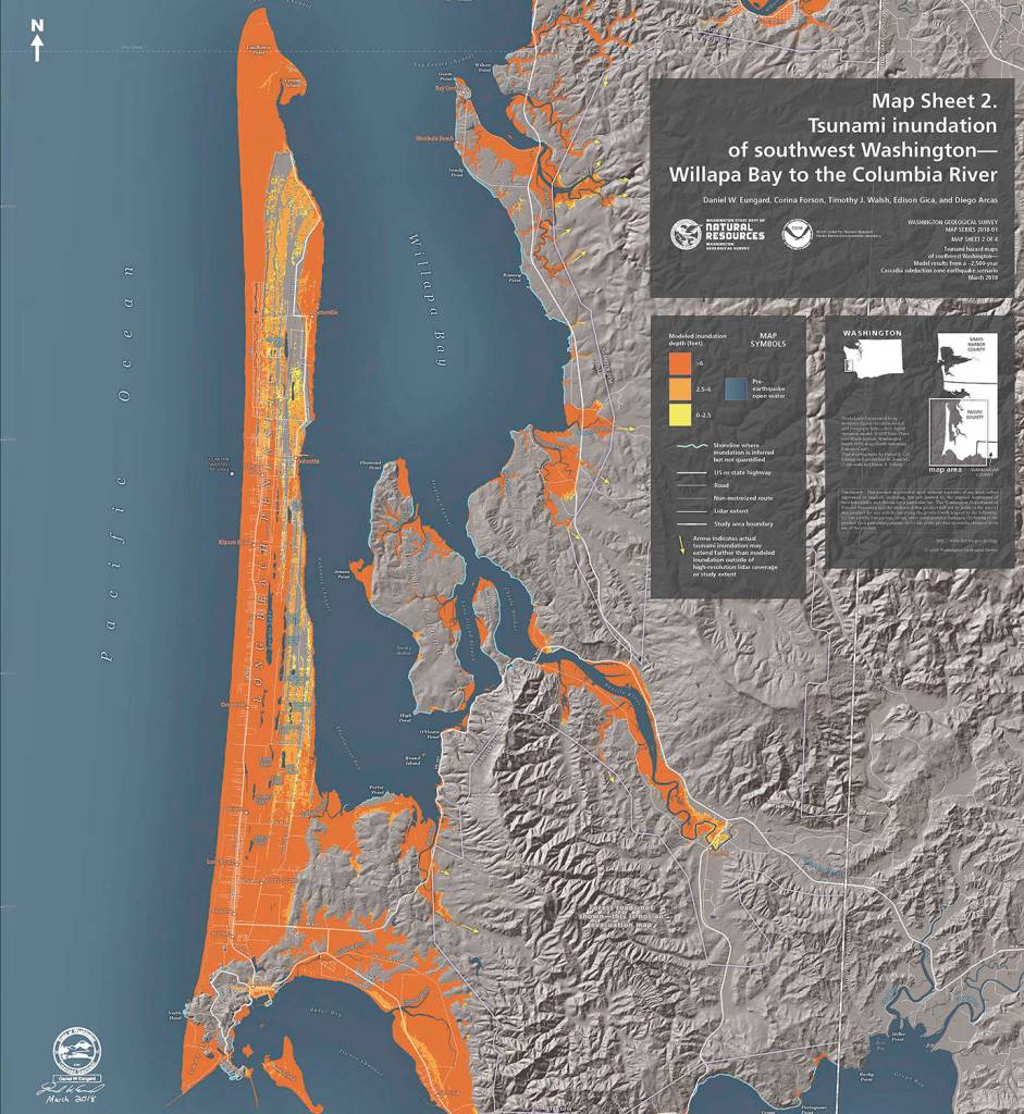 New tsunami inundation maps released by the State Department of Natural Resources Monday show a magnitude 9.0 earthquake off the coast of Grays Harbor and Willapa Bay could create a tsunami that could hit the outer coastline at more than 40 mph with waves ranging from 20 to 60 feet for at least 12 hours before subsiding.