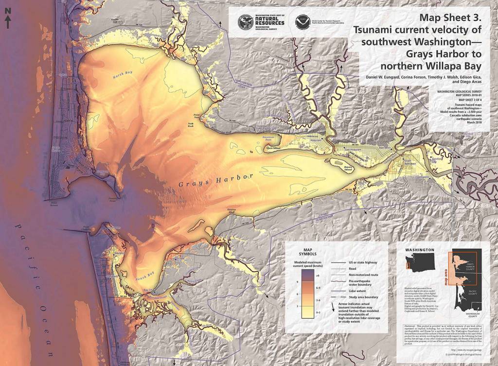 The report, authored by five scientists with the Washington Geological Survey, used something called finite-difference modeling to create the maps. The report said while areas on the outer coast would see surges to 60 feet, inside both Grays Harbor and Willapa Bay, waves would be in the 10 feet or less range.