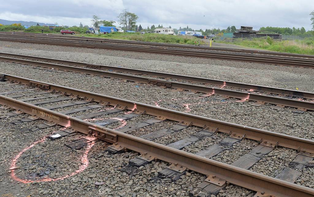DAN HAMMOCK | THE DAILY WORLD                                Bright spray paint surrounds the area where a 48-year-old woman had both legs severed when she was struck by a train early Thursday morning. The photo was taken at the track closest to the end of South Michigan Street just south of Harbor Battery and State Street, facing south and east toward the Chehalis River.