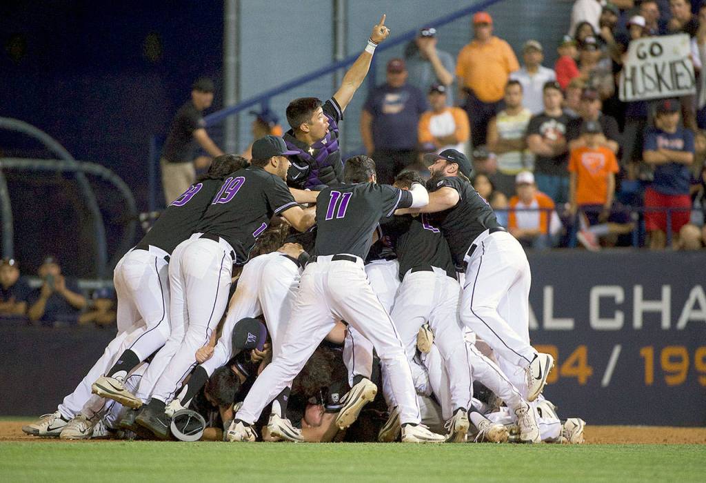 The Washington Huskies celebrate after defeating Cal State Fullerton on Sunday to earn a trip to the College World Series, the first in the school’s history. (Photo by Matt Brown)