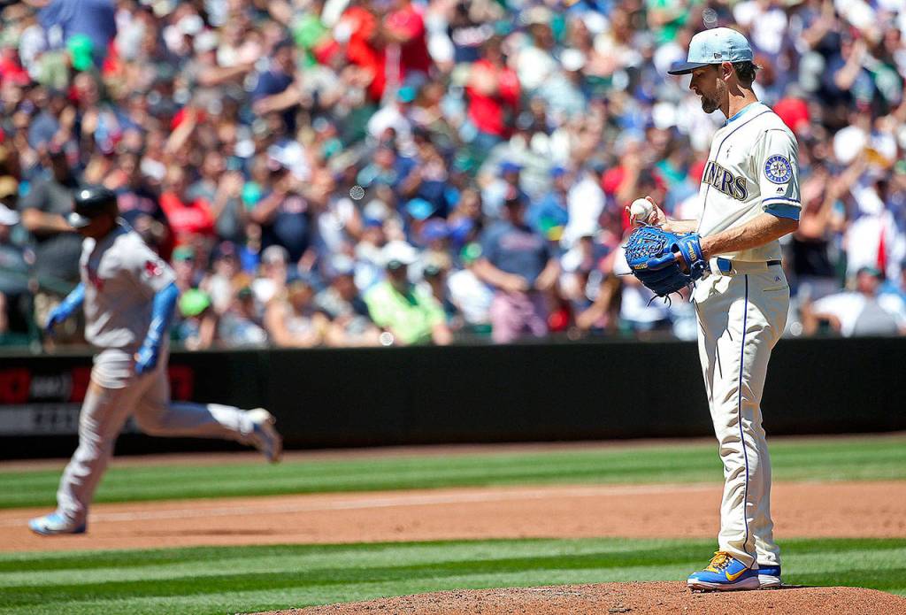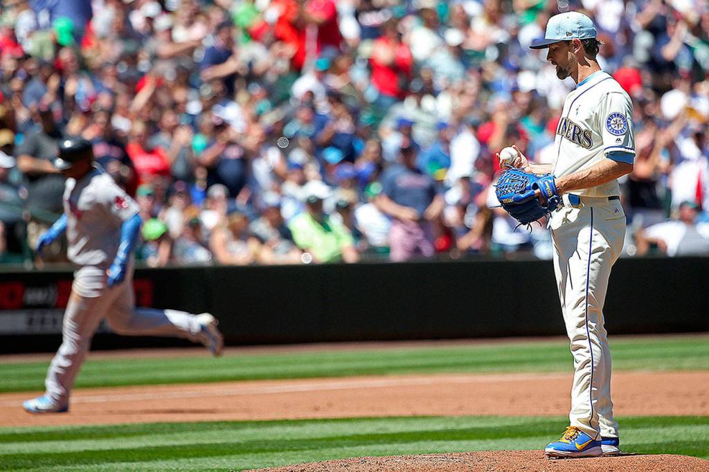 Seattle Mariners pitcher Mike Leake looks on as a fifth run scores during the disastrous third inning of the final game in the series against the Boston Red Sox on Sunday, June 17, 2018 at Safeco Field in Seattle, Wash. (Ken Lambert/Seattle Times/TNS)