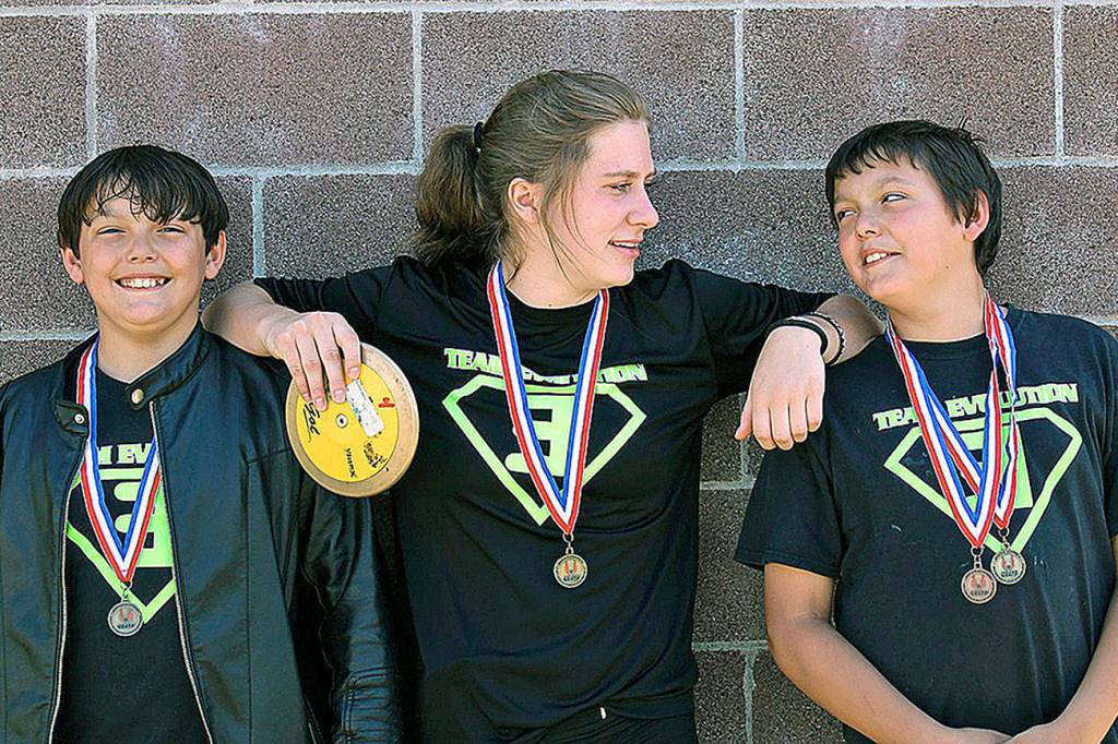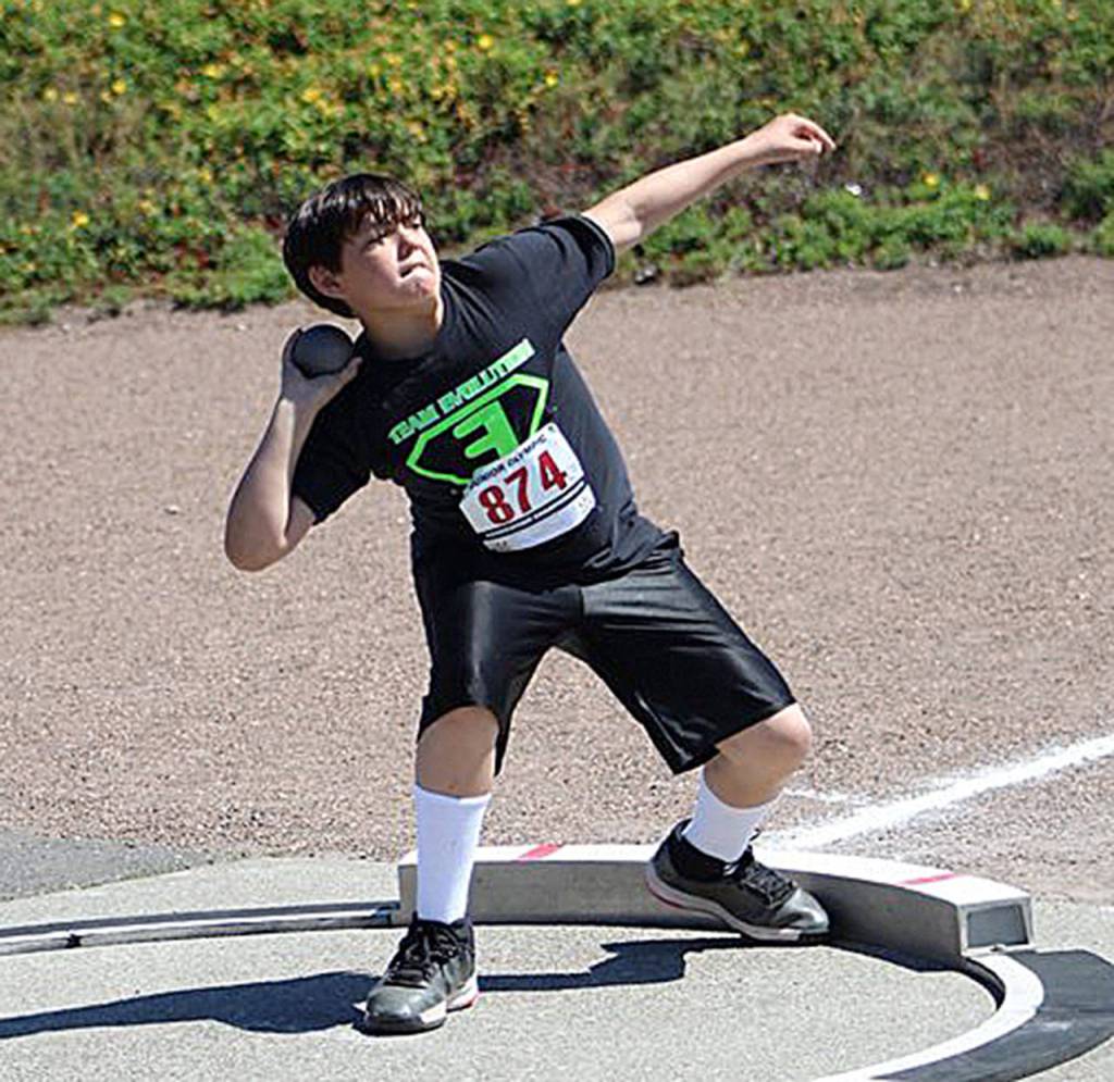 Ten Team Evolution athletes qualified for the regional meet by claiming hardware in Tacoma, led by a very familiar name to Twin Harbors area sports fans. Former Raymond High School standout and eight-time WIAA state champion, Karlee Freeman was up to her usual crowd-pleasing performances as she swept the Girls 17-18 year-old discus and shot put competitions. Freeman dominated the field, winning the discus with a throw of 50.10 meters — nearly 10 meters better than Tahoma Track Club’s Jordan Fong (40.19, 2nd place) — and tossing the shot put a personal-best 15.07 meters, which according to Evolution head coach Shaun Straka Sr., was the second longest throw in state history in Freeman’s age bracket.