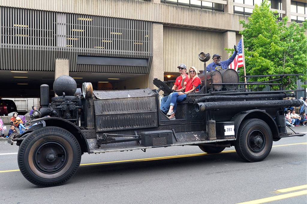 LOUIS KRAUSS | THE DAILY WORLD The scorched firetruck recovered from the Aberdeen Museum of History that burned down recently was driven through the Founders Day Parade on Saturday.