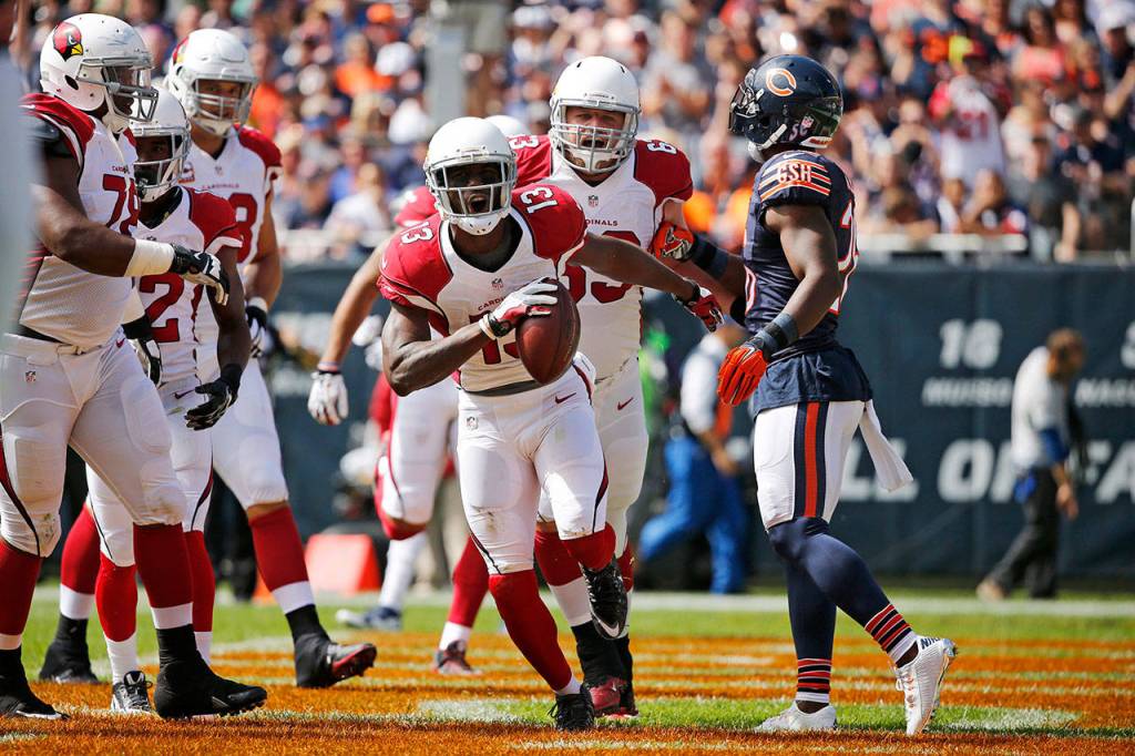 Former Arizona Cardinals wide receiver Jaron Brown (13) celebrates a touchdown run against the Chicago Bears in 2015. Brown signed with Seattle in March. (Jose M. Osorio/Chicago Tribune/TNS)