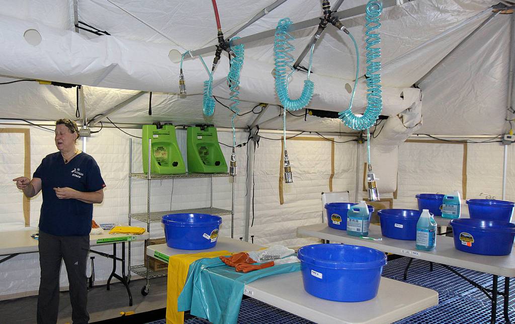 Part of the drill was locating a facility to house the many stations involved in handling a hundred or more birds during a spill. Warehouse 19, on the west end of the Satsop Business Park near the Grays Harbor Energy Center plant, was found to have adequate space, power and water to house the operation.