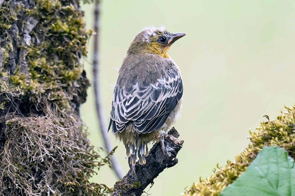 Nesting: Pair bonds last throughout the single breeding season. The female picks the location and both work up to 15 days or so to build the nest. It is usually in a hardwood tree or willow, hanging from flexible branches to discourage predators, and hangs about 10 to 25 feet above the ground near water. It is a pendulous basket of woven hair, twine, grass and wool, and lined with plant down, hair and feathers. The female typically incubates four to five eggs for about 11 days then broods the young for about 14 days before they are able to branch, then fly. Both parents feed the young during this time and the family unit stays together even after the young leave the nest and are able to feed themselves. They often join other family units in post-breeding flocks.