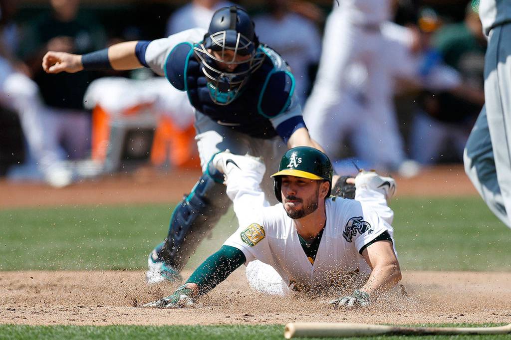 Oakland Athletics’ Matt Joyce (23) slides safely into home plate against Seattle Mariners’ Mike Zunino (3) to score a run on a two-run single hit by Oakland Athletics’ Marcus Semien (10) in the sixth inning on Sunday in Oakland, Calif. (Nhat V. Meyer/Bay Area News Group/TNS)