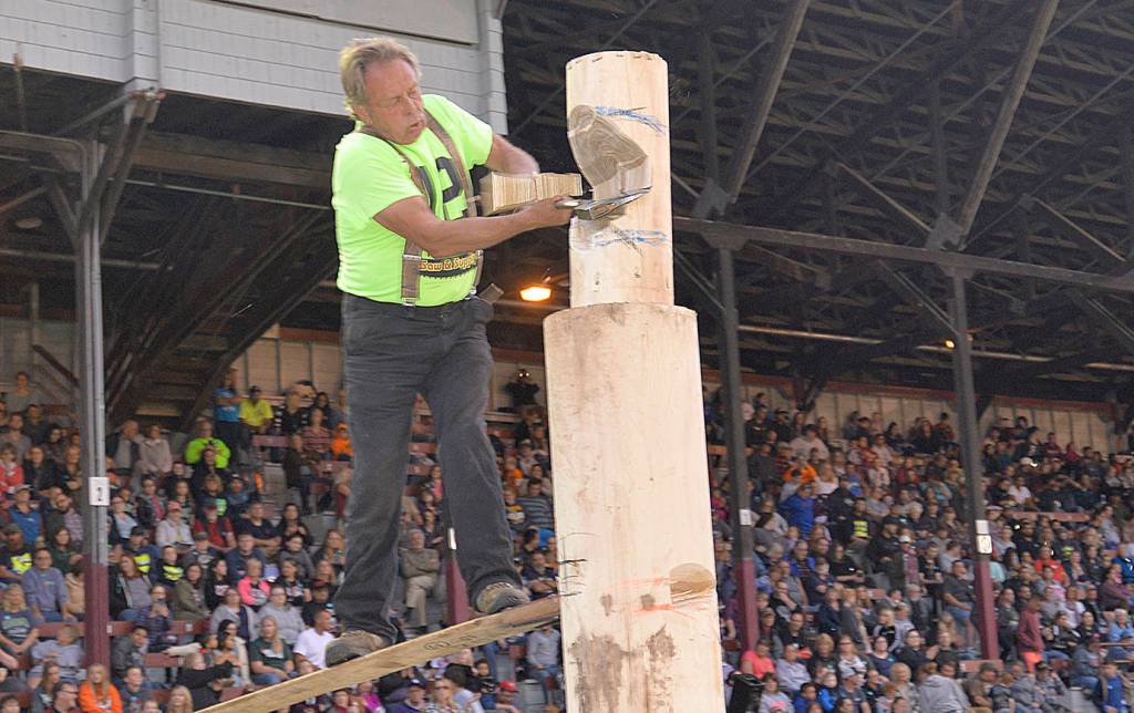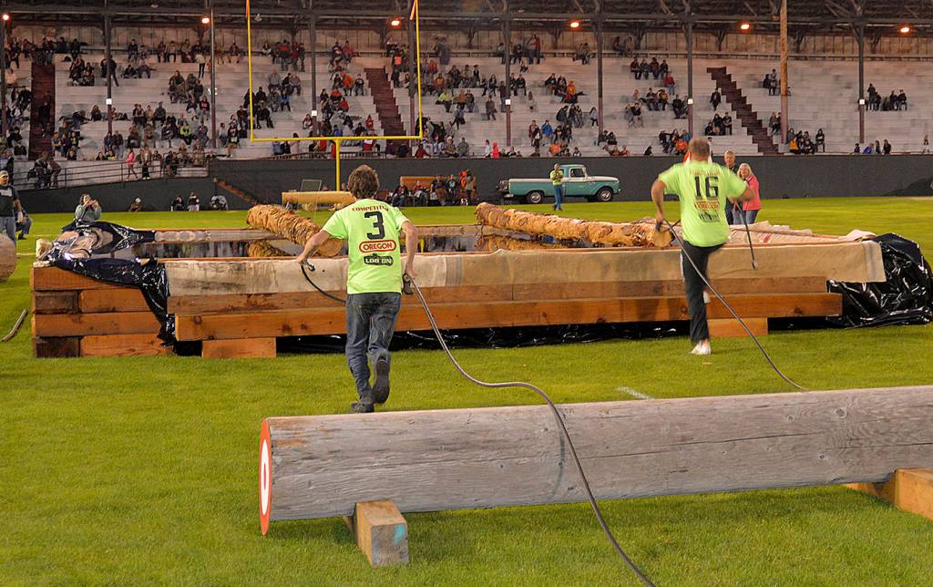 Roaring chainsaws and showers of sawdust, not to mention log-rolling mayors, highlighted the 54th annual Hoquiam Loggers Playday competition Saturday evening.