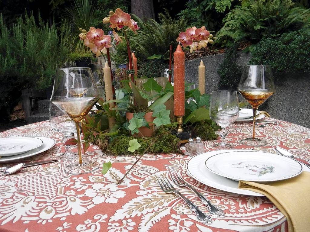 I was perplexed about what to do for a centerpiece. Normally I would use a simple bouquet of roses, but none of the colors I found worked with the tablecloth. Tina in the Aberdeen Safeway floral department was a big help. She led me to some small orchids in terra cotta pots that had blooms matching my tablecloth. They were perfect!