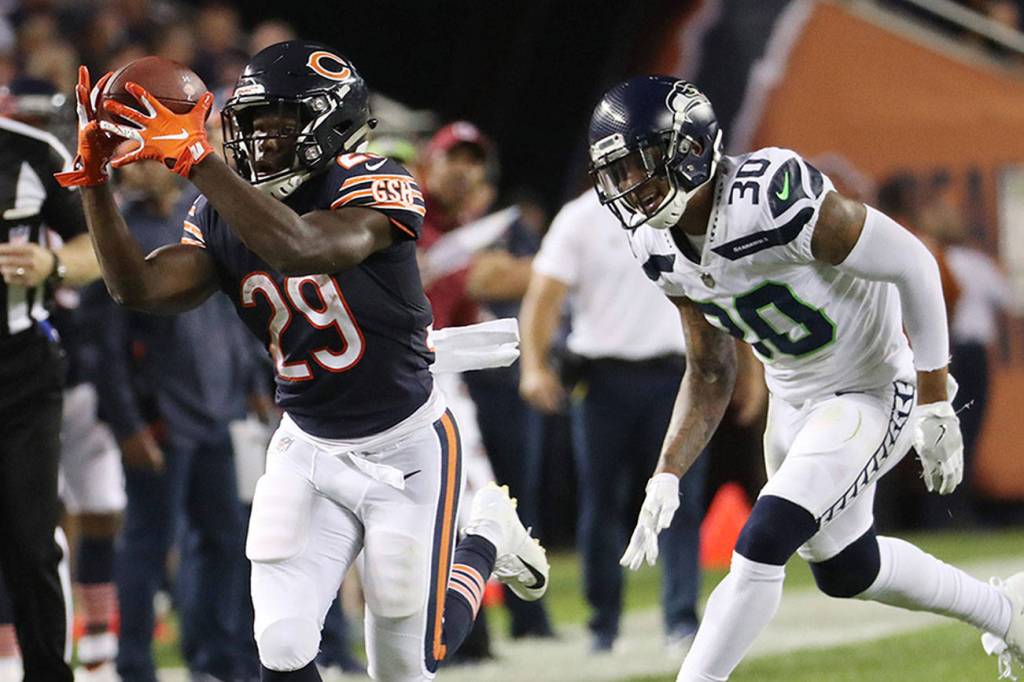 After Chicago went ahead 17-3 on a 10-yard touchdown pass from Mitch Trubisky to Anthony Miller 40 seconds into the final quarter, the Seahawks decided to go up-tempo again. And they zipped 11 plays to their first touchdown of the night. Tyler Lockett grabbed Wilson’s pass over the back of face-guarding Bears defensive back Kyle Fuller for a 19-yard score.