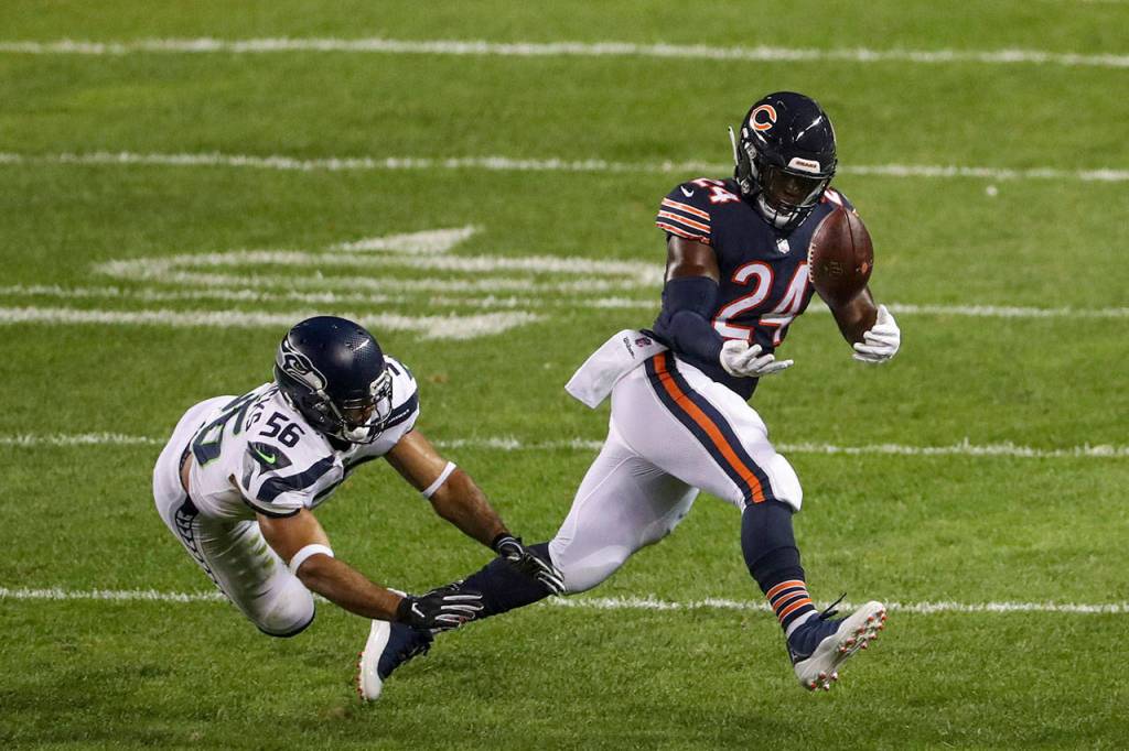 It was no better on offense early. After those first three runs by Carson to begin the game, the Seahawks ran it two times the rest of the quarter. Meanwhile, the Bears sacked Wilson five times on 19 drop backs among all those pass plays. That left Wilson dumped 11 times through two games, the most in the NFL this season.