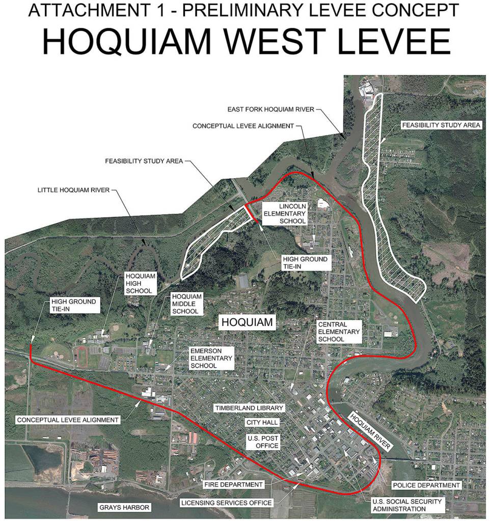 The west segment levee would tie in with high ground north of State Route 109 just west of the high school, continue south and east to the west bank of the Hoquiam River, north along the west bank of the river, then wrap around Lincoln Elementary school, tying into high ground to the west.
