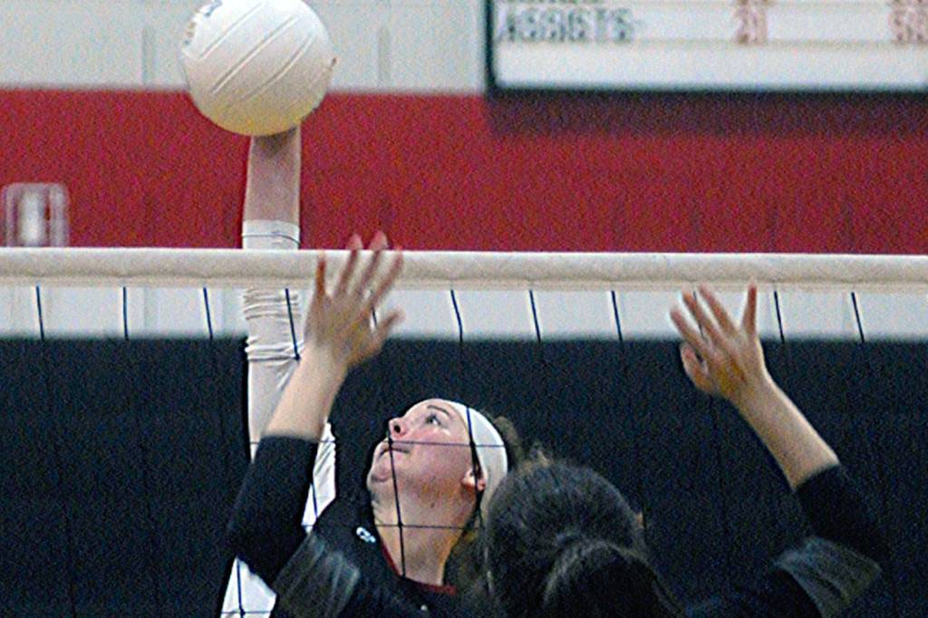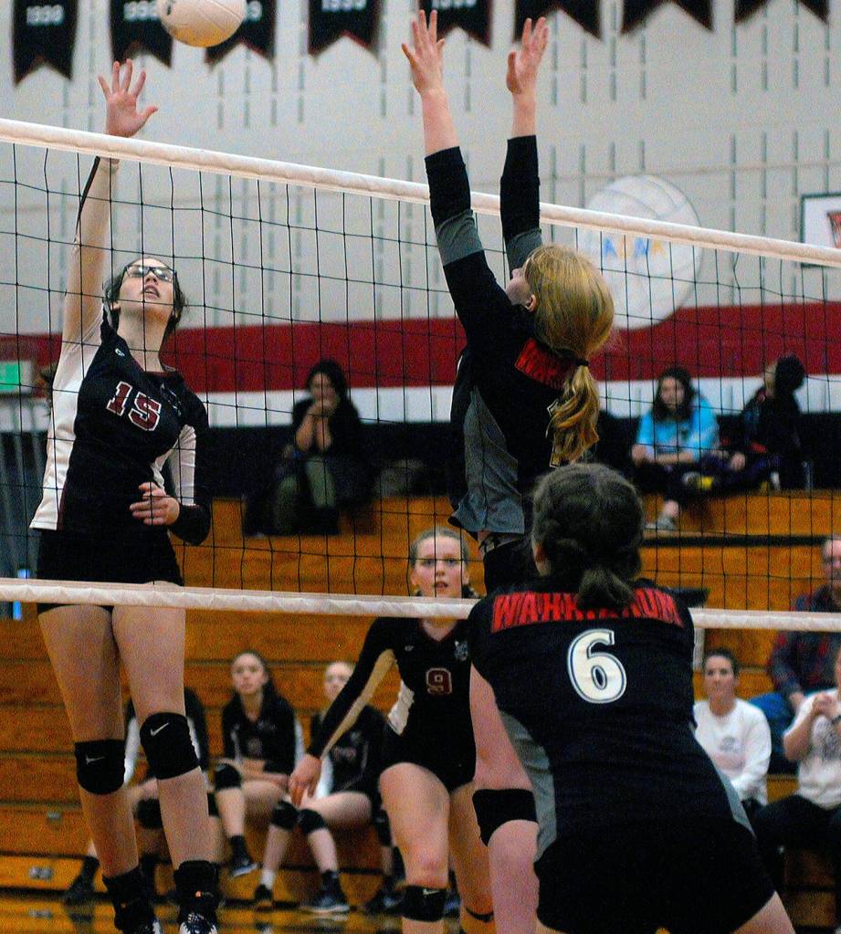 Ocosta’s Kaylee Barnum gets a kill against Wahkiakum in the second set on Saturday. Barnum led the team with 22 kills in the match. (Hasani Grayson | Grays Harbor News Group)