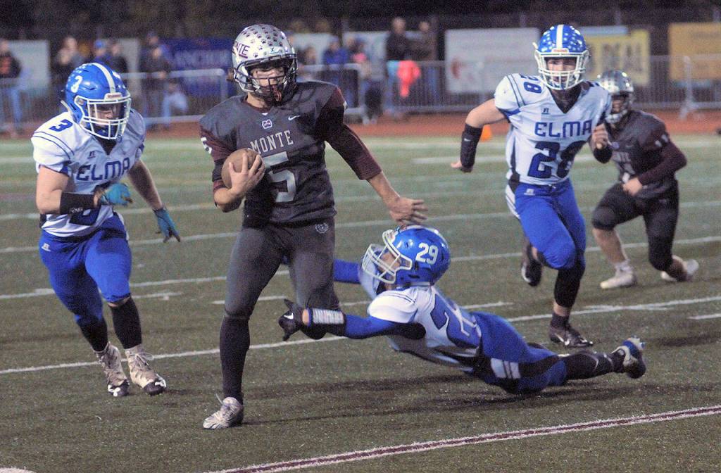 The East County Civil War was not without controversy. With 1:32 left before halftime, a fracas erupted at midfield following a short run by Monte’s Teegan Zillyett. The pushing-and-shoving match that ensued resulted in the ejection of Elma’s Carter Jacobson.