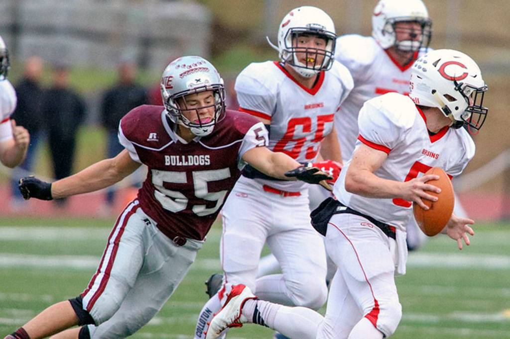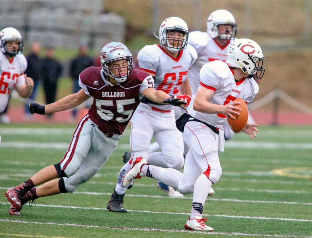 Montesano defender Kai Olson, left, chases Columbia-White Salmon quarterback Austin Charters during the Bulldogs’ 24-12 win on Sept. 14. The two teams will face off in a 1A District IV Crossover game at 7 p.m. on Friday at Montesano High School. The winner advances to the state playoff tournament. (Photo by Shawn Donnelly)