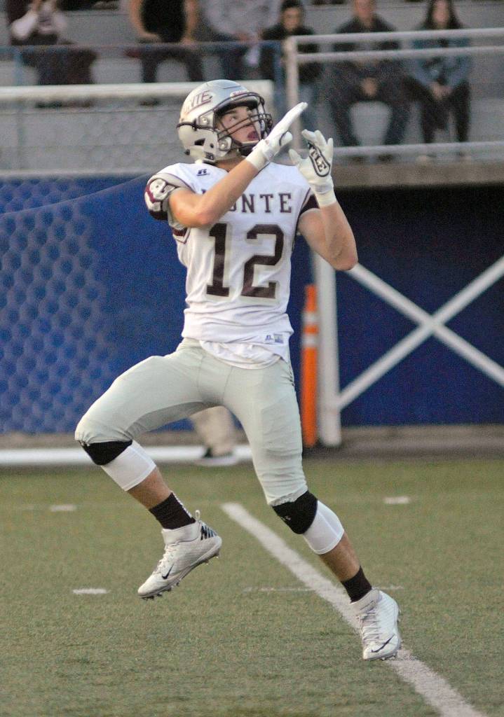 Montesano receiver Sam Winter caught seven passes for 164 yards and two touchdowns, including the game-winner with 25 seconds left, in the Bulldogs’ 25-19 win over Elma on Friday. Winter was named The Daily World’s “Game Ball” winner for offense for his efforts. (Hasani Grayson | Grays Harbor News Group)