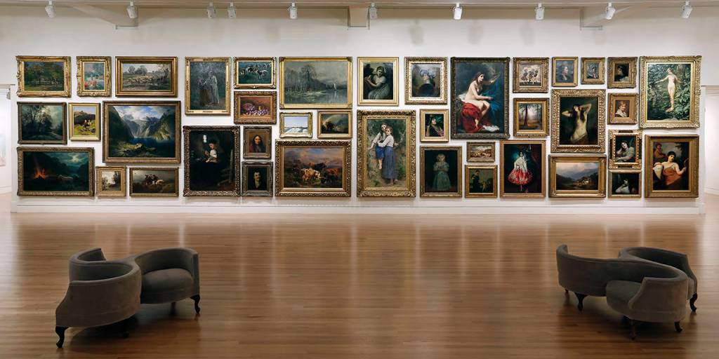 The “salon style” of hanging art came about over 200 years ago, when the French Royal Academy displayed its students’ works like that. It was an efficient way to display numerous paintings. Artists jockeyed for positioning, with the least desirable location being up toward the ceiling and the most coveted being at eye-level.
