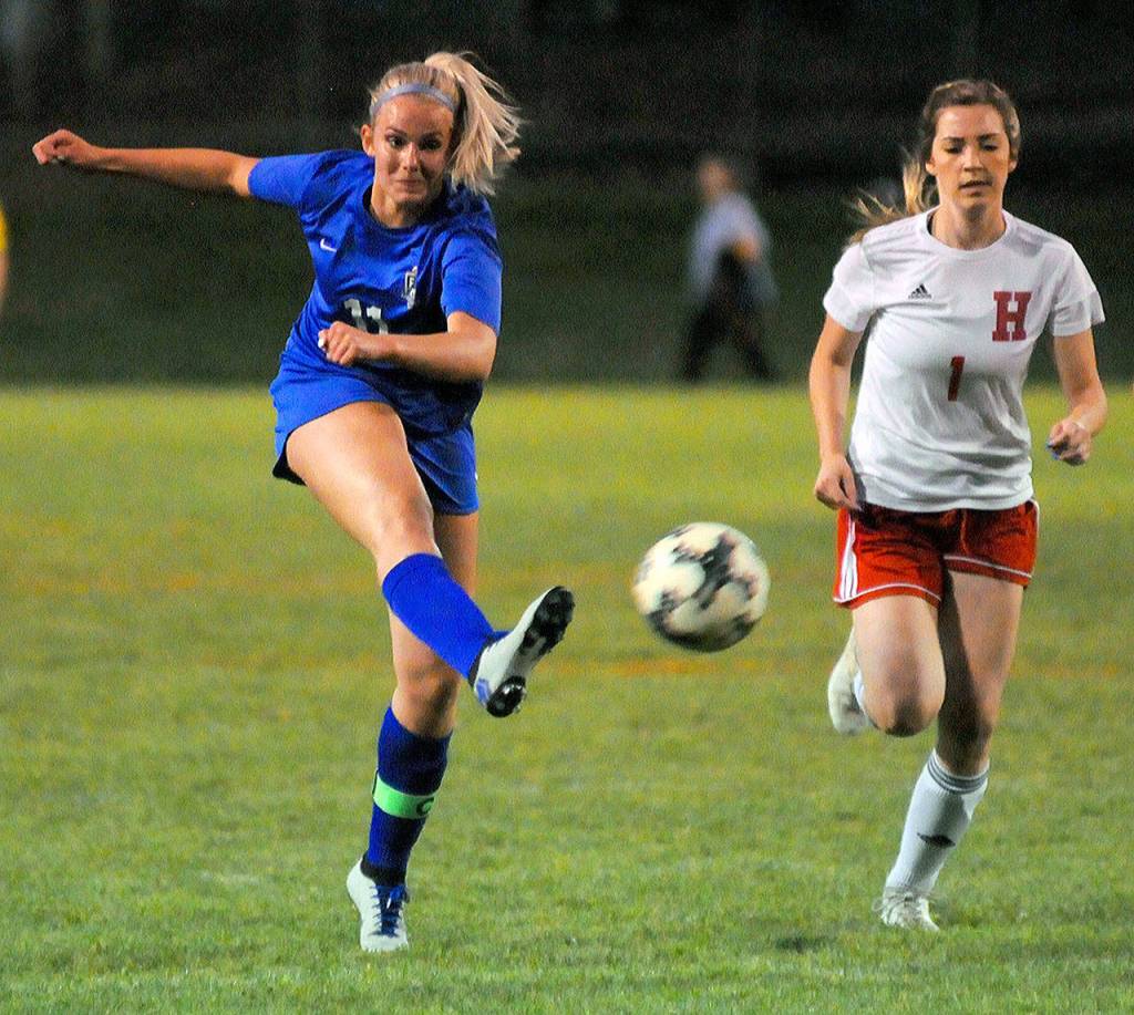 Elma’s Brooke Sutherby, left, takes a shot on goal during a home game against Hoquiam on Sept. 27. Sutherby was named the 1A Evergreen league’s co-MVP for offense earlier this week. (Hasani Grayson | Grays Harbor News Group)